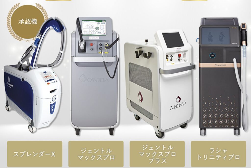 | 施術機器 | スプレンダーX(熱破壊式) ジェントルマックスプロ(熱破壊式) ジェントルマックスプロプラス(熱破壊式) ラシャトリニティプロ(熱破壊式) NIR Plus(蓄熱式) |